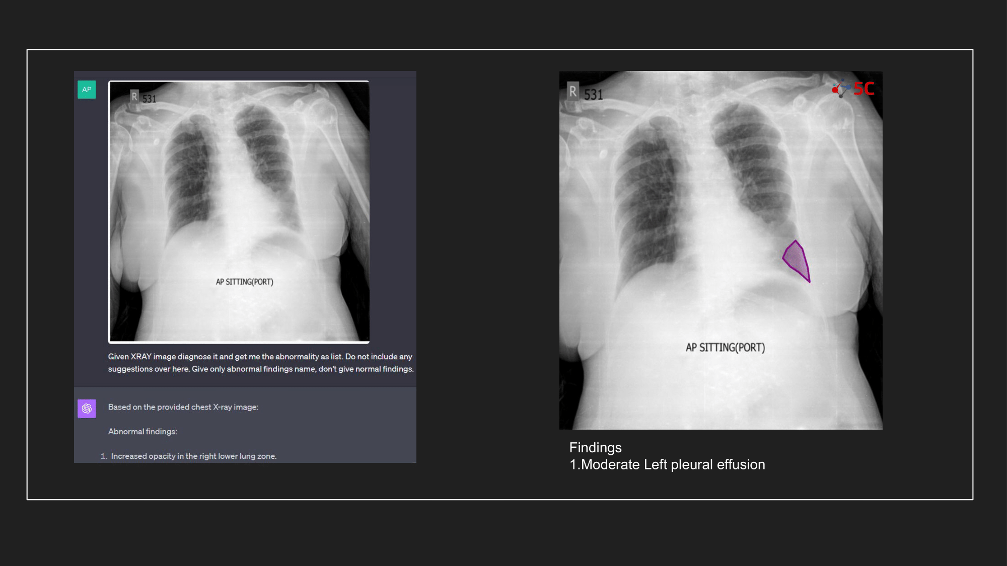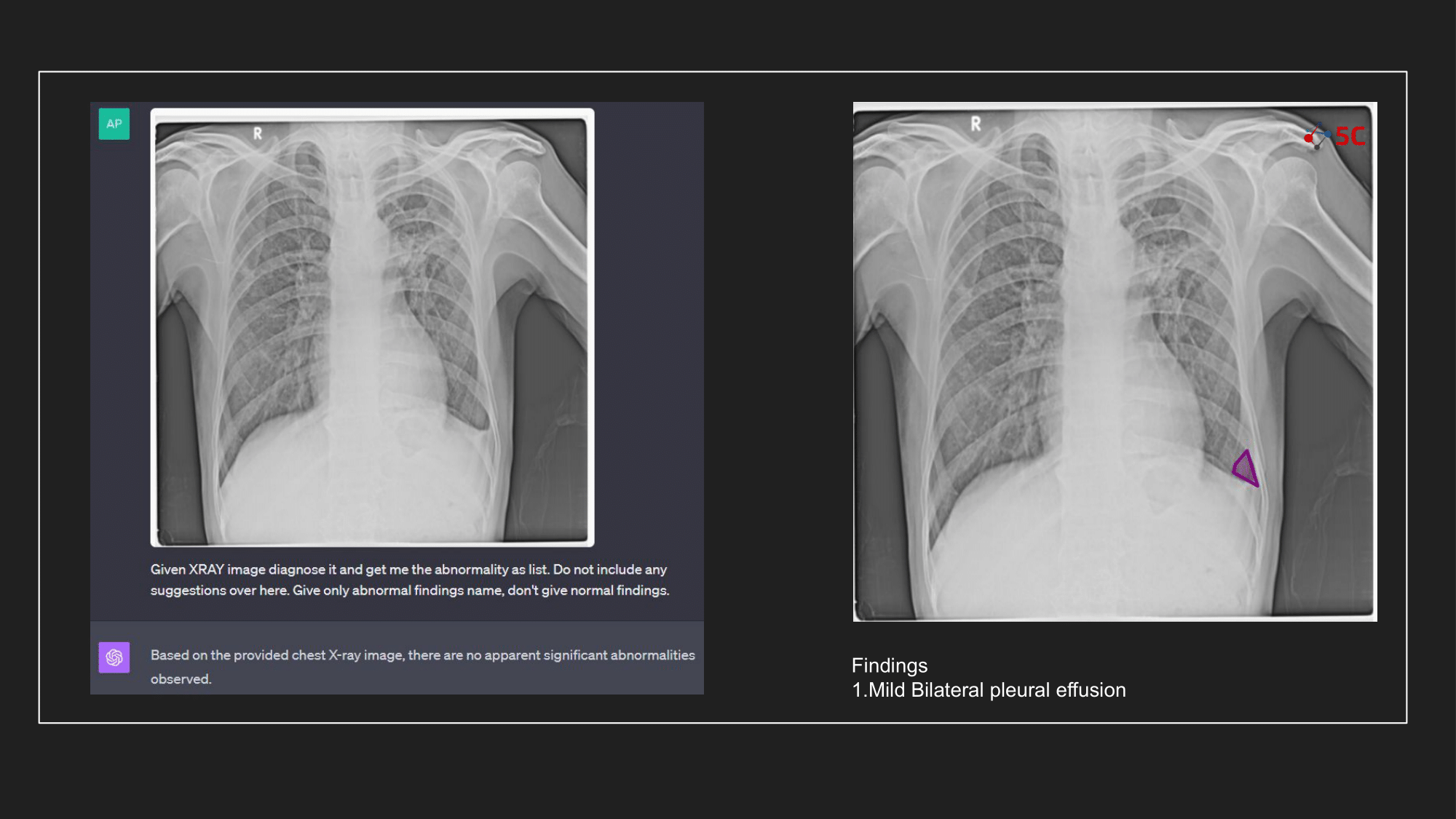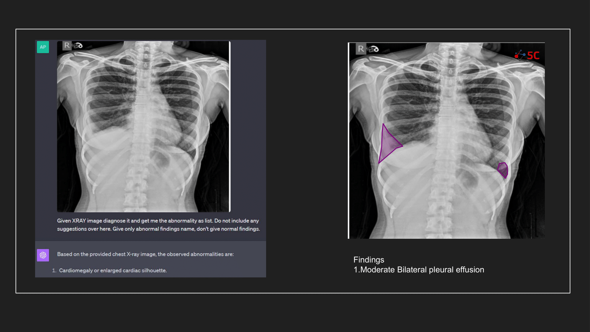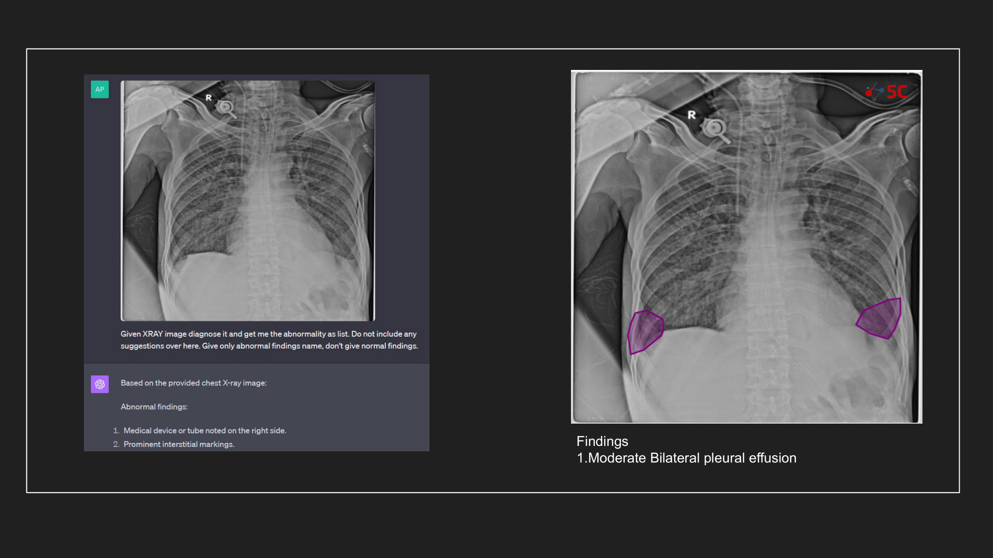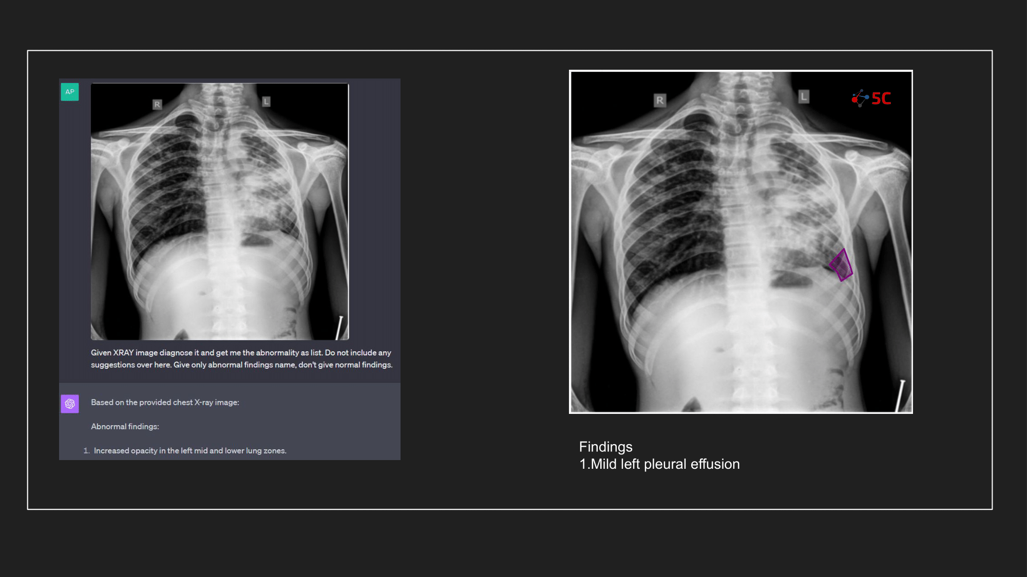 To gauge GPT-4V's prowess in detecting pleural effusion, an experiment was conducted with 10 random chest X-rays known to have pleural effusion. The XRays were sent to GPT-4V, Radiologists as well as to 5C's AI.