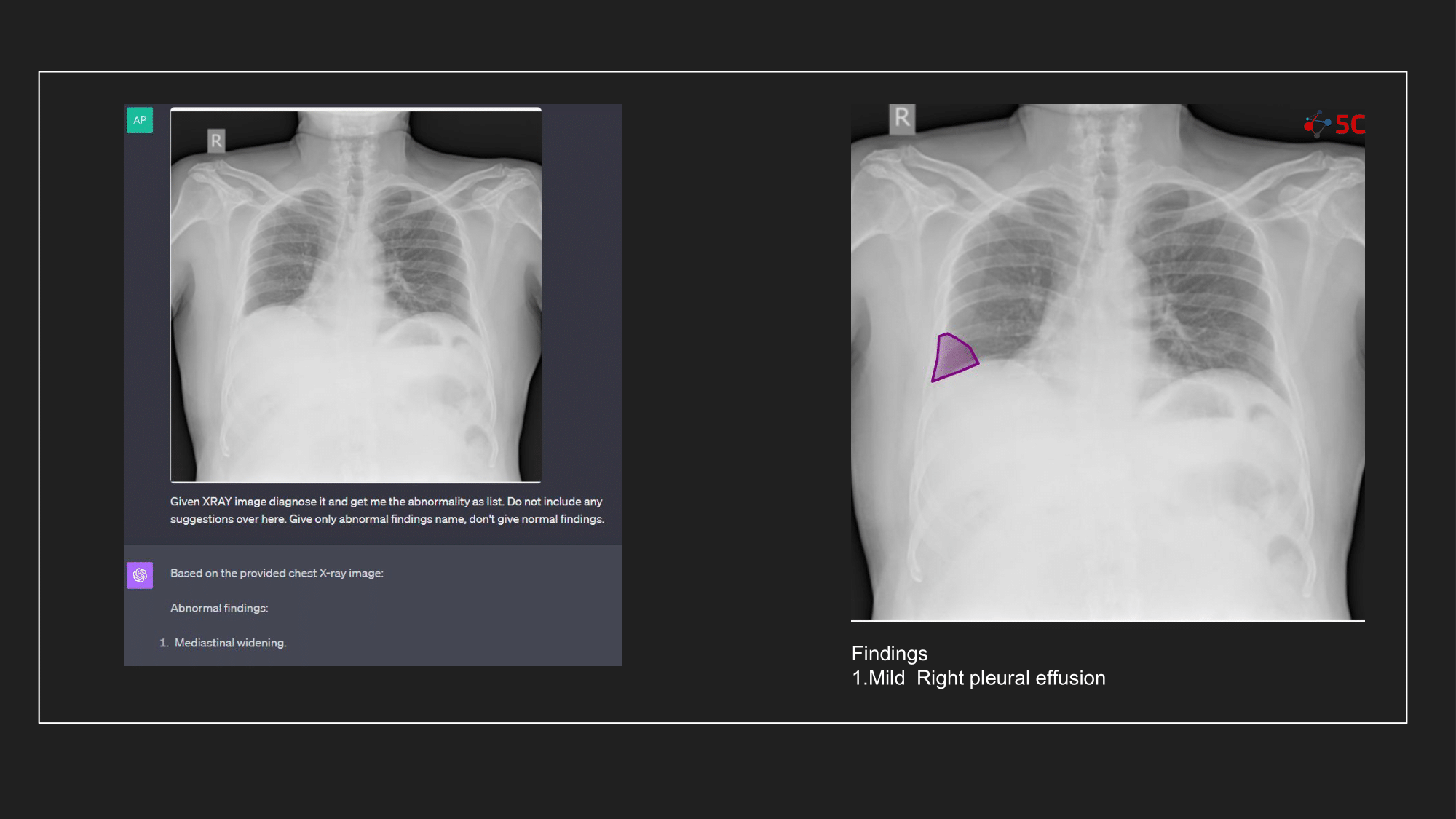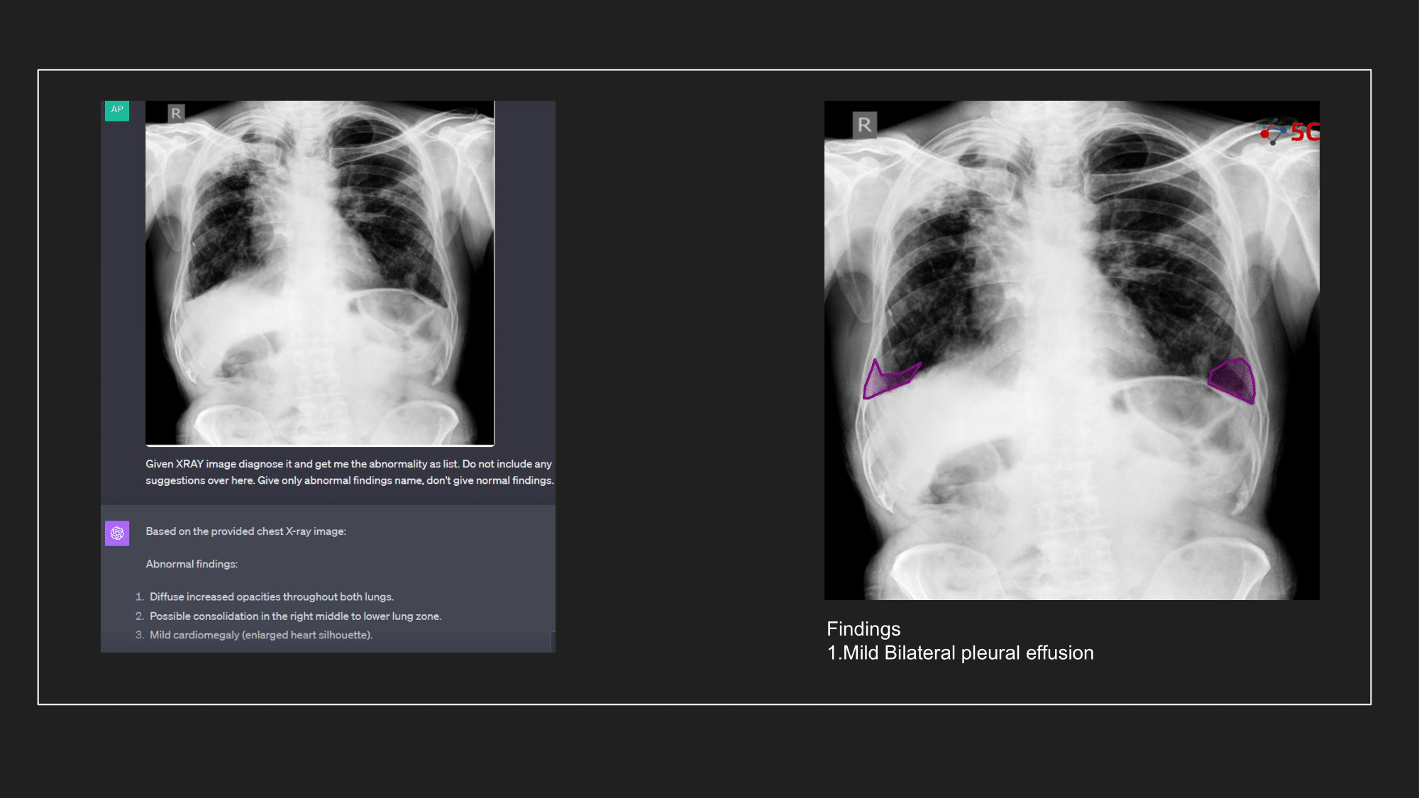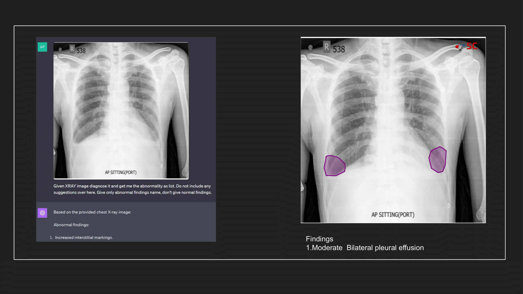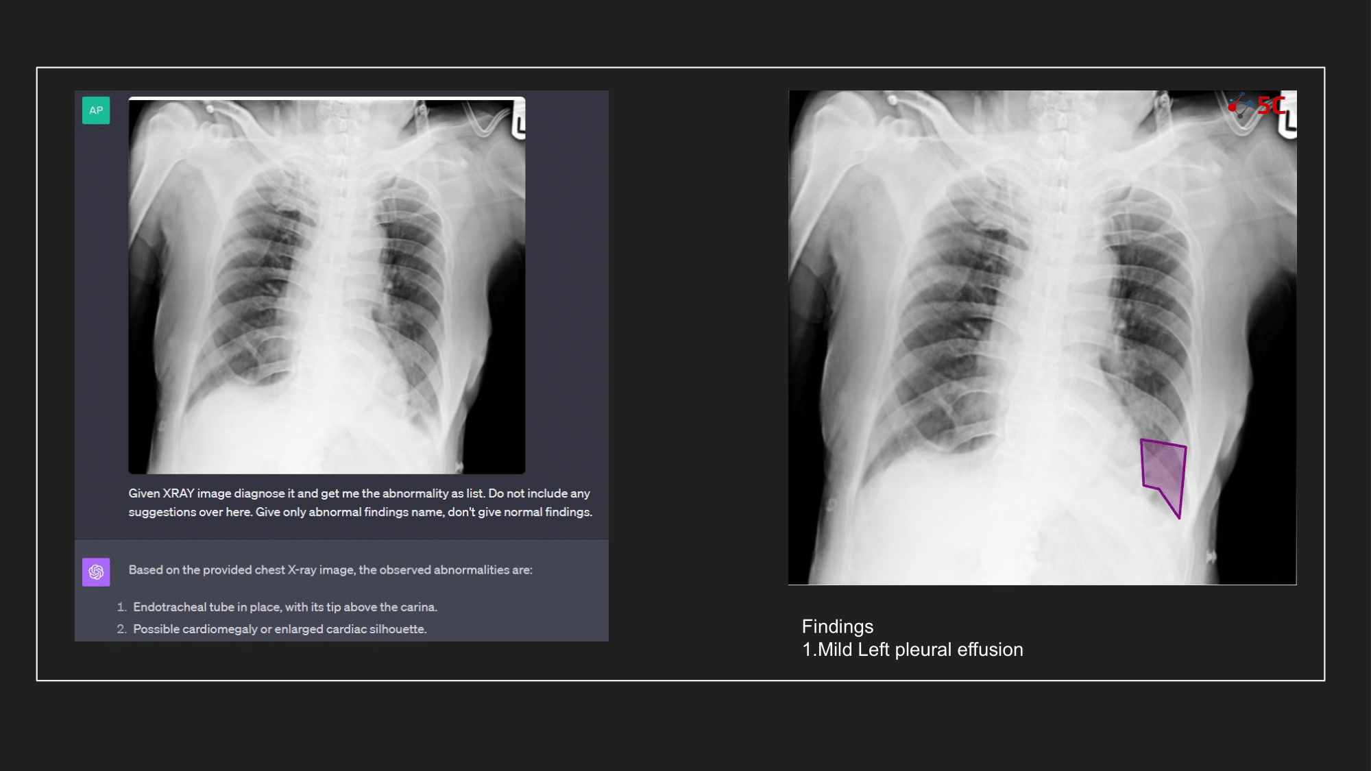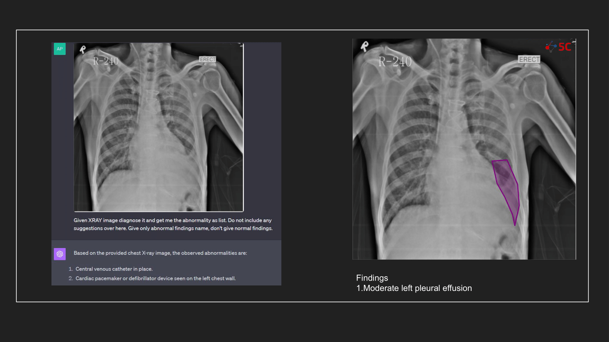 To gauge GPT-4V's prowess in detecting pleural effusion, an experiment was conducted with 10 random chest X-rays known to have pleural effusion. The XRays were sent to GPT-4V, Radiologists as well as to 5C's AI.